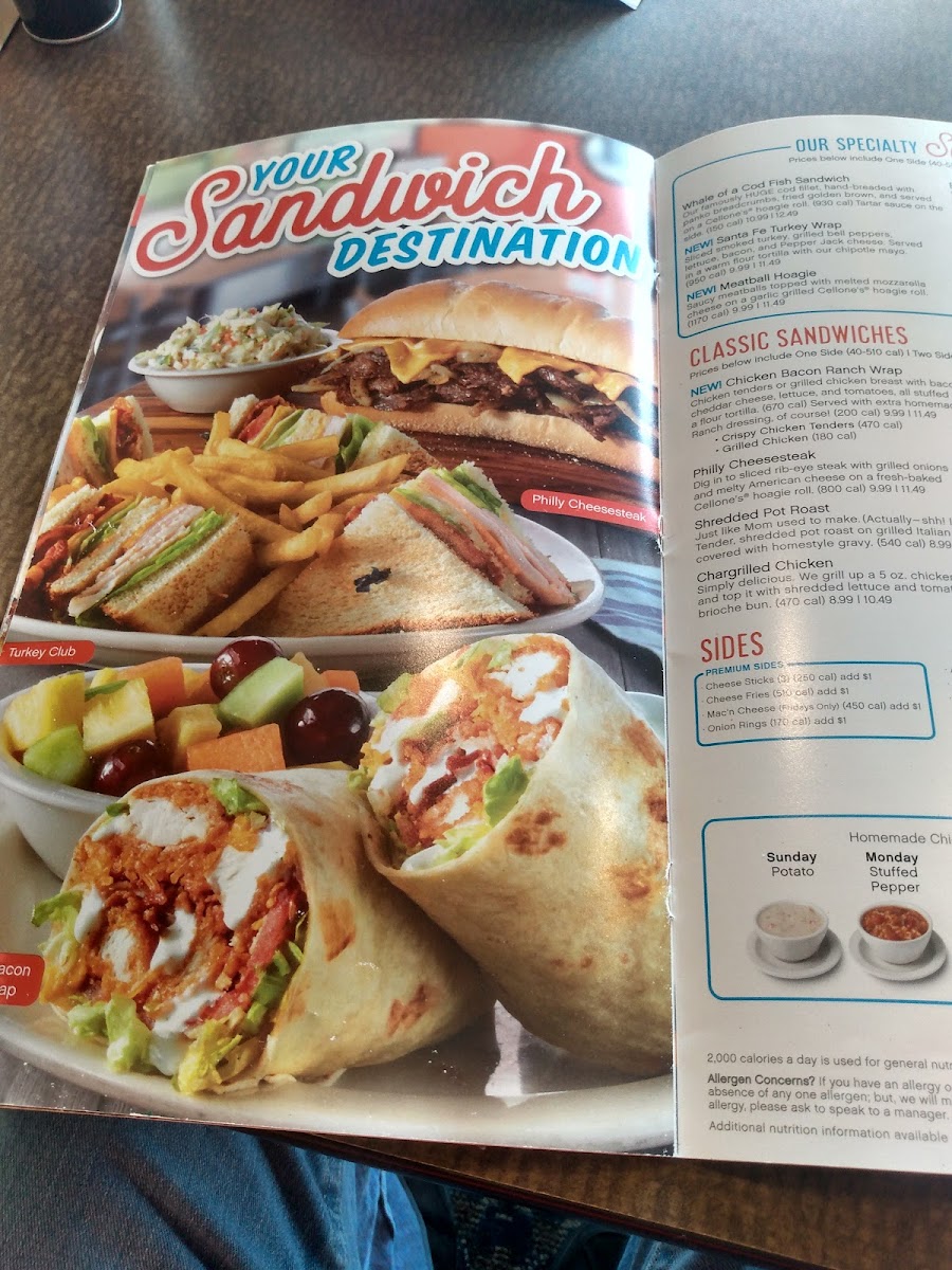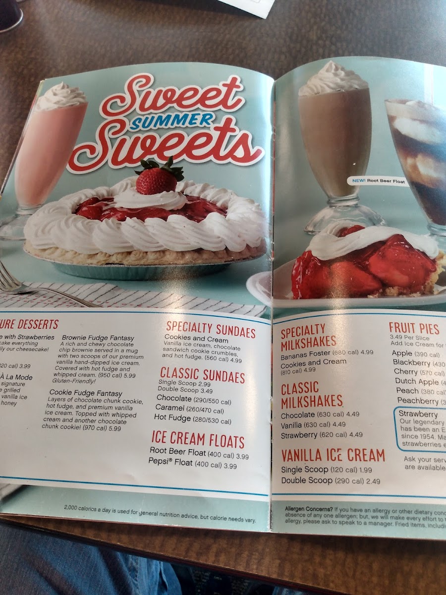 Start your morning with warm favorites like Chocolate Chip Pancakes or French Toast with Banana Syrup, paired with a specialty coffee or a rich milkshake. Lunchtime and dinner invite you to dig into heartier plates such as the Super Burger with Fries, a Philly Cheese Steak, or the timeless Turkey Dinner. Lighter options like the Salad Bar and soups, including Chicken Noodle Soup and chili, provide comforting choices for any appetite. Don’t miss the delicious sides like Tater Tots or Mozzarella Sticks and finish with a slice of pie or a classic Oreo Milkshake for a subtle sweet note.